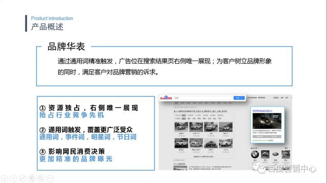 品牌华表在你的品牌还没有建立的时候,帮你的品牌进行导流。那么用户如何知道一个品牌?有一部分用户是通过检索需求词,比如用户搜一个十万的SUV,他的需求明确,搜索之后呈现的所有结果和信息对他来说都非常重要,可以帮助他来决策的。品牌华表通过右侧的位置展现出来一个广告,算是整个搜索页面最大的图片,用户第一眼就会看到这个品牌。那么用户会看吗?会,因为客户的需求是一个10万元的SUV。但是用户看了就会买吗?不一定。生活服务也一样,对于决策成本高的产品也会有一个选择的过程。比如一个婚纱摄影的品牌,客户买品牌词的同时还应该尽可能的覆盖潜在的需求,即一些通用需求词,华表是可以覆盖这些词的。