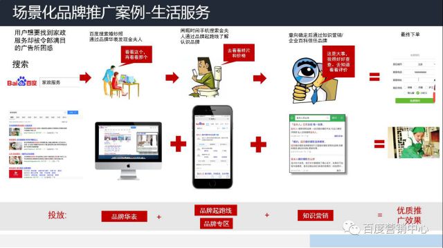 用户搜索家政服务,通过对几个品牌的分析比较,最终选定一个品。用户初识一个品牌是通过华表,了解是通过品专或者品跑,最后信任这个品牌可以通过知识营销帮助他建立。