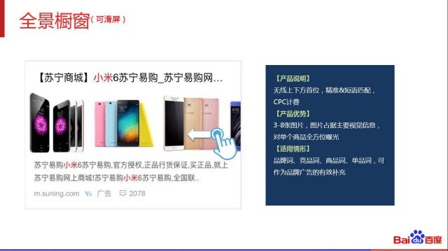 新的橱窗系列拥有更大图片,相比原有图片增大1/3;增加了炫酷的滑屏效果,当图片超过3张时,自动开启滑屏功能;无线首位强势呈现,将大幅提升企业的商品广告效果;根据前期实验数据,开启滑屏后,相比静态版橱窗样式,平均点击率提升20%以上。 移动端展现 闪投移动端橱窗进入滑屏时代: 1、滑屏开启:物料超过3张图片,默认开启滑屏功能。 2、滑屏关闭:物料等于3张图片,默认关闭滑屏功能。