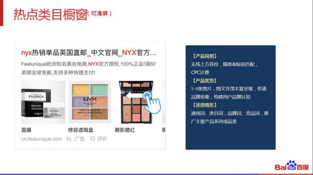热点类目橱窗 热点类目橱窗适合消费者在熟悉收集信息阶段影响他们。“热点类目橱窗”,图文并茂,在图片下方增加类别表述,持续推广适用通用词、类目词,品牌词、竞品词,推广主要产品系列或品类。比如消费者在搜索品牌词,或者行业通用词时,我们这个案例中,消费在搜索NYX这个彩妆品牌时,可能是对这个品牌感兴趣,通过朋友了解,口碑不错,特别是上色堪比大牌的开架产品,所以想了解,有没有好看的颜色适合自己的彩妆,此时,我们就适合展现品牌下多种类型的产品,吸引消费者进一步浏览。