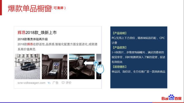闪投产品因其广告样式新颖、图片样式展现,而备受企业主的青睐。最大的优广播电视广告势在于,创意点击率高,占据至少3个推广间距非常吸睛,而且对于购买力提升有着重要的推动作用,因为企业可以展现更多的热门产品和信息,链接直达落地页,更精准。这样的创意彰显权威,转化率更高。 为适应移动搜索新体验,打造更好的商品广告效果,闪投橱窗系列产品(含商品橱窗、热点类目橱窗、爆款单品橱窗、全景橱窗)在今年进行了全新的迭代升级,今天我们将一起了解橱窗系列样式以及如何提升审核、展现。