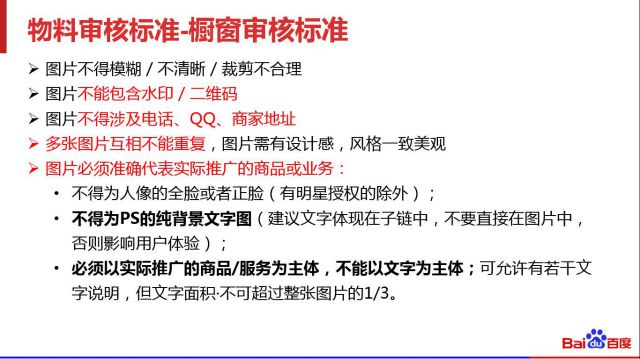 通过前面样式介绍,不难发现,橱窗系列是图片强样式的曝光。所以对于图片也有着比较严格审核,这当中包括机器审核和人工的复审。接下来我们一起了解下审核规则,帮助我们能够快速的广告上线。 如何确保物料过审