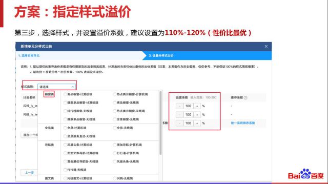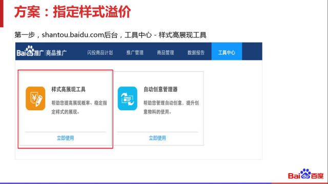 除了基本的清晰之外,一下几点特别需要注意:不能包含水印/二维码、不得涉及电话、QQ、商家地址、图片不重复、图片能够体现业务。对于最后一条,图片需要体现业务,是经常遇到的问题,纯营销口号的,体现出来了产品,但是文字部分超过1/3,同样不能过审。 如何确保账户有展现 闪投的样式是根据网友搜索体验智能展现的,如果希望能够增大展现几率,可以通过“样式高展工具”。