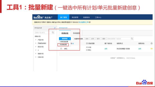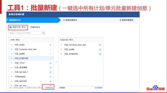 如何高效完成 1批量新建 新建无线/计算机端创意,勾选计划时,可以选择全部添加,为计划批量增加。