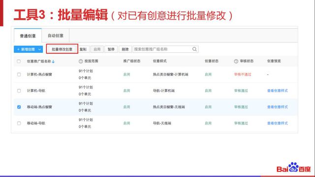 3批量编辑 产品落地页或者产品类目需要修改时,可以使用批量修改创意功能。根据下载的表格格式,进行新内容的批量修改,上传至系统即可。