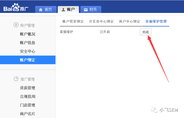 第六步坐等百度客服人员过来找你(因为你关闭后,百度客服可以收到信息的) 友情提示:如果你平时的账户操作是交给百度客服人员,或者说平时需要百度客服人员给你辅助做一些账户操作的话,就不要关闭这个功能了。