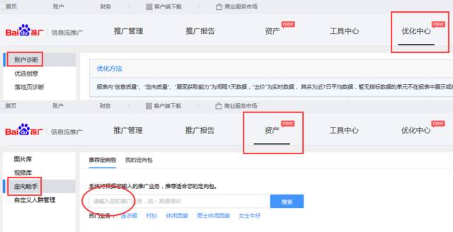 [百度后台有注明] 另外,百度的智能推荐还是非常人性化的,登录网页客户端,分别点击「优化中心——账户诊断」和「资产——定向助手」,系统会推荐一些比较优质的定向包和意图词,用不用随意。