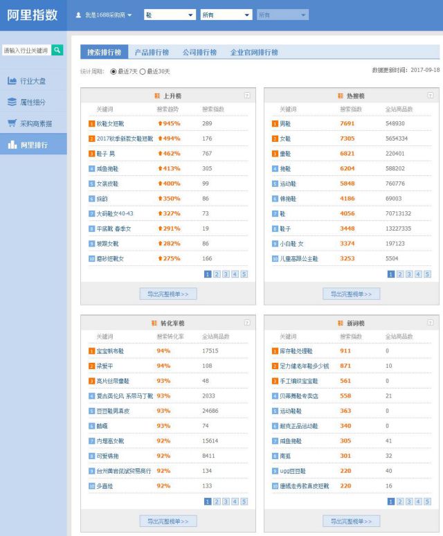 [优化中心-账户诊断;资产-定向助手] 接下来我重点说一下怎么人工找「意图词」。 2.意图词 百度做搜索起家,所以意图词(关键词)权重还是挺高的。拓词方法很多,如果是出身做起来会很快,如果不是也别怕,我推荐这三个拓词渠道。 ① 阿里指数 搜索品类,阿里会提供淘宝热搜词包,可以直接下载到本地,复制粘贴选用。