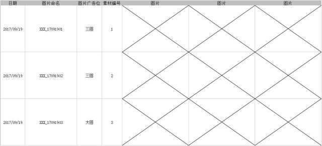 [看商品标题] 上传素材,写文案 1.上传素材 提前让设计师做不同广告位的素材,我习惯每次3组,拿到设计师素材后,先给「素材编号」方便命名渠道码。具体的编号看团队是公用素材库还是个人素材库。我是个人库,所以是每个产品都单独从1开始编号,表格记录上传时间、图片命名、广告位、图片编号、图片,如图示。