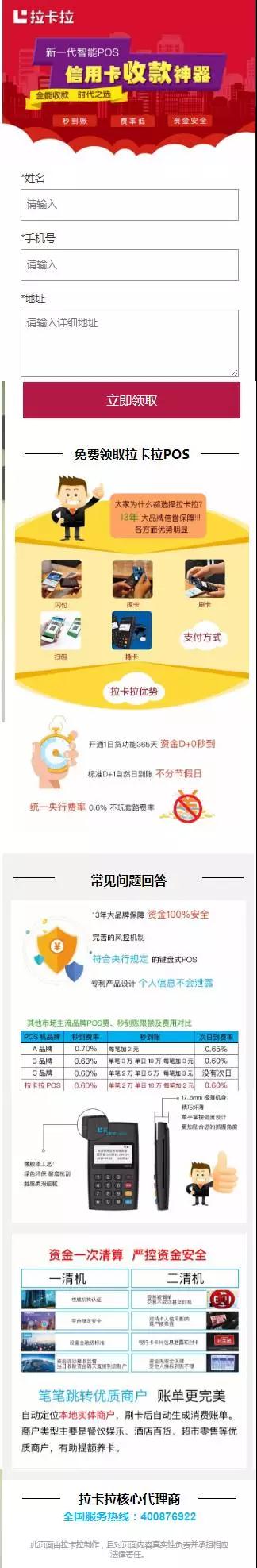 转化亮点: ● 整体页面素净和谐,设计精简。以淡绿色为主色调,只用了两张典型场景图,没有多余装饰,主题更加鲜明突出 ● 优势卖点排布合理有冲击力。“0元打车“、”100元打车券”给予用户强大吸引,为排布其下的其他四个优势吸引目光 ● 文案简短精准。直击消费者最关心痛点,提出需求并解决需求 拉卡拉收款宝 推广目的:集客 转化率较同行业:+160.8% 转化成本较同行业:-76.3%