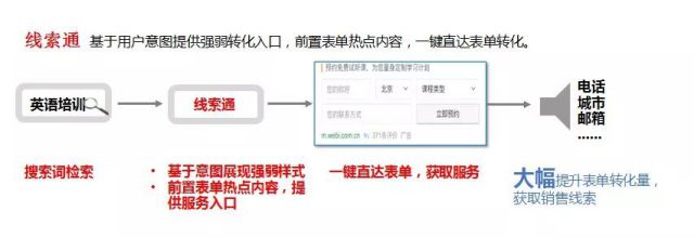 前营销大背景下,流量收紧,用户习惯发生改变,企业主也应调整自身投放策略。传统路径比较繁琐,每一个环节都会造成客户流失。基于这种情况,为了提高转化效果,线索通就是把转化区设置在移动页面的显著位置上,简化用户获取服务的中间流程,减少用户流失。也就是说,网民不用进入网站,直接在结果页就能获得服务,将客户的服务、咨询能力前置,在展现层级引导网民与客户产生强、更可控的交互。
