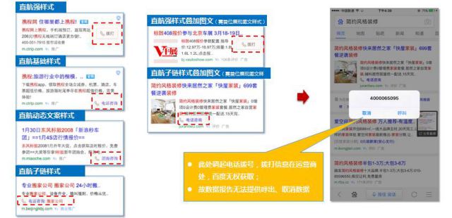 下面给大家介绍一些线索通的样式: 1.电话通-直航 网民在创意阶段点击拨打或电话咨询按钮便可直接与企业电话沟通,无需进入网站再获取联系方式。