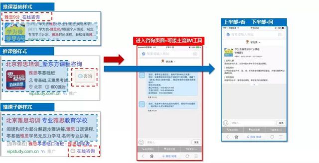 线索通-回呼 3.咨询通-推课 部分网民不喜欢电话沟通,更需要在线与企业客服文字交流。下图中便是介绍推课这一形式。目前可接主流IM工具。推课形式上半软文 报价部分看,下半部分咨询,起到浏览+沟通双向效果。