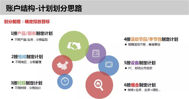 如何搭建一个好的账户推广结构? 建立推广计划是您设计账户结构的第一步。在开始之前,建议大家细分出一个或多个明确的推广目标,并为不同目标建立不同的推广计划。我们可以从以下角度考虑: 计划常见划分思路 建议:每个账户内推广计划的数量不少于2个