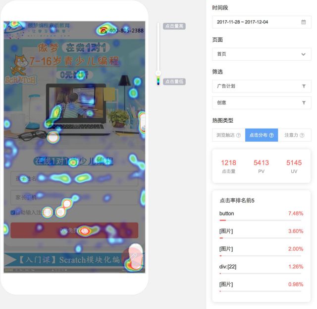 (浏览触达热图:清晰显示浏览用户百分比) 2 点击分布:关于用户点击行为的热图分布,颜色越红的区域,代表用户点击越多。通过对点击热图的分析,能极速获取页面中用户最乐于点击的区域和内容,将广告需要突出的信息结合用户习惯,为提升转化提供明确的优化策略。