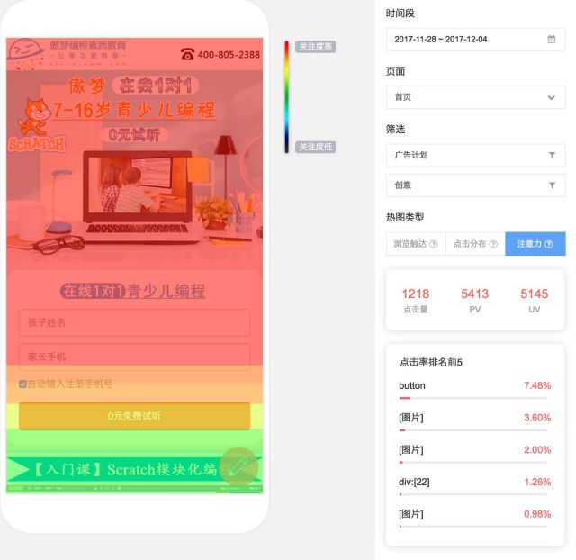 (点击分布热图:调整数据条,获得最热点击区域) 3 注意力:注意力是关于用户停留时长的热图分布。颜色越红的区域,代表用户在该区域停留的时间越长。这项指标能给出用户最感兴趣的、最关注的内容分布,从图片或文字内容上给出优化方向。
