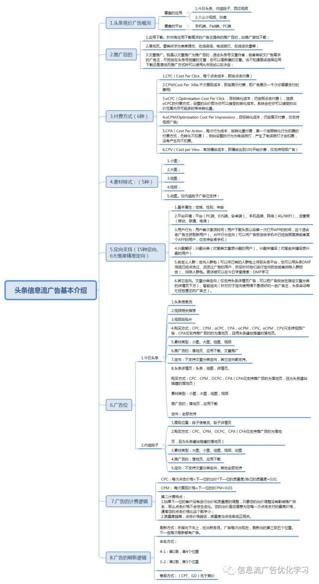 覆盖应用:3大应用:今日头条、内涵段子、西瓜视频;后期会发展头条旗下的火山小视频、抖音; 覆盖平台:手机端、Pad端、PC端; 推广目的:3种 1.应用下载。针对有应用下载需求的广告主提供的推广目的,如推广游戏下载。 2.落地页。营销诉求为表单提交、在线咨询、电话拨打、在线成交量等。 3.文章推广。既是以文章推广为推广目的,适合头条号文章作营销的由来者,或者有软文广告需求的广告主,可投放在头条号创建的文章,也可以是新建的文章。 当不知道是该选择应用下载还是落地页推广方式时可以使用A/B测试以后决定。 付费方式:6种 1.(Cost Per Click,每个点击成本,即按点击付费) 2.CPM(Cost Per Mile,千次展现成本,即按展示付费,即广告展示一千次你需要支付的费用) 3.oCPC(Optimization Cost Per Click ,目标转化成本,仍按照点击付费),选择oCPC的付费方式,设置的出价即为你可以接受的转化成本。系统会在你可以接受的出价范围内尽可能多的带来转化量。 4.oCPM(Optimization Cost Per Impressions怎样化解公关危机,目标转化成本,仍按展示付费,仅支持) 5.CPA(Cost Per Action,每次行为成本,按转化量付费,第一个按照转化行为扣费的付费方式,无转化不扣费),例如设置的行为为电话拨打,产生了电话拨打才会扣费,没有产生则不扣费。 6.CPV(Cost per View,有效播放成本,即播放达到10S开始计费,仅支持视频广告) 素材样式:5种 小图;2.大图;3.组图;4.视频;5.动图。仅内涵段子广告位支持 定向支持:(15种定向、6大维度精准定向) 基本属性:地域、性别、年龄; 平台环境:平台(PC端、IOS端、安卓端)、手机品牌、网络(4G/WIFI)、运营商(移动、联通、电信); 用户行为:用户首次激活时间(用户下载头条以后第一次打开APP的时间,这个适合老广告主获取新用户)、APP行为定向(可以将广告投放给手机中已经按照某类或者某个APP的用户,仅支持安卓手机); 兴趣爱好:兴趣分类(对某类文章感兴趣的用户)、兴趣关键词(对某些关键词感兴趣的用户); 自定义人群:定向人群包(可以将已有的人群包上传到头条平台,也可以用头条DMP筛选已经点击过、浏览过广告的用户,然后针对他们进行定向投放或者排除人群投放)、排除人群包。更详细可以在今日学堂搜索:DMP学习; 其它定向:文章分类定向(仅支持头条详情页广告,可以把广告投放在指定文章分类的详情页下方)、智能定向(针对对于定向使用得不是很好的一些广告主,头条自动帮忙经验匮乏的广告主)。 广告位: :信息流广告位:头条信息流广告位、视频相关推荐、视频后贴片;详情页广告位:头条详情页、组图详情页; 内涵段子:段子信息流;段子详情页; :西瓜信息流 头条竞价广告基础逻辑: 刷新逻辑;刷新方式:手指向下向上,拉出新条目。广告每次出现在,刷新出的第三到五个位置。不一定每次刷新都有广告。 命名方式:4-1:第1刷,第4个位置3-2:第2刷,第3个位置 售卖方式:(、GD)先于竞价 广告排序逻辑: 广告展示的预估收益:ECPM=质量度(预估点击率影响最大)*出价 头条系统根据ECPM来进行广告排序,ECPM越高排名就越靠前,得到的展示机会就越大。想提高ECPM那么就要提高你的点击率和出价。