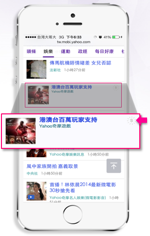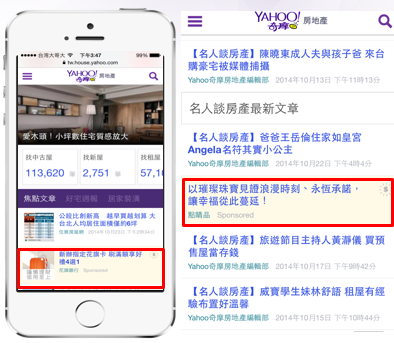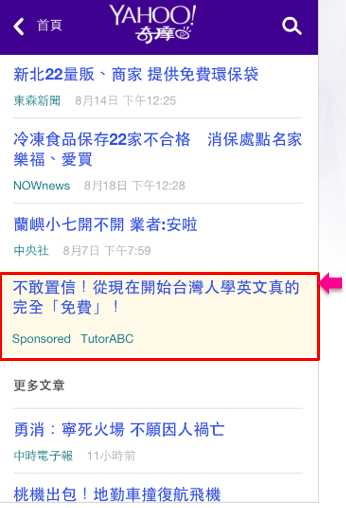 关于Yahoo奇摩原生广告的文章已经在网站发布过几篇了,也不知道作为广告主的你对Yahoo奇摩原生广告的了解又有多少呢?接下来,我们进入正题,Yahoo奇摩原生广告的广告位置。 目前Yahoo奇摩原生广告开放的广告版块有三个,分别是Yahoo奇摩行动网页,Yahoo奇摩PC网页(电脑+手机+平板)以及Yahoo奇摩行动APP。 小编为了方便大家观看,特意为大家拟了一个清单,请大家的视线下移。 Yahoo奇摩行动网页广告清单: 1.行动首页 广告是出现在第二则,往后每7则就会出现一则原生广告,2、9、16以此类推。这个广告位置的单日浏览量人次突破1100万。