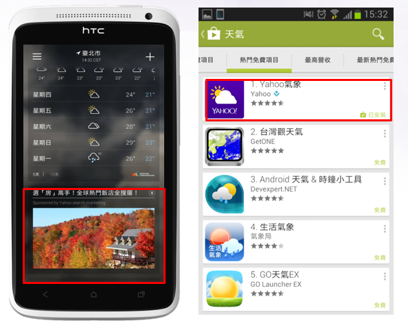 焦点新闻的广告是采用大图+文字的形式,图片的建议尺寸为1200*627px。第一则广告是出现在信息列表的第三位,以后7则就会出现一则广告。广告位为3,10,17以此类推。(广告位会根据国外测试进行优化调整) 2、气象APP Yahoo气象APP是仅限于安卓手机的一款APP,是气象类APP下载量位居首位的APP。它的广告位置是在地区气象资料下方的一则大图广告,大图的尺寸为1200*627为最佳。 ASO