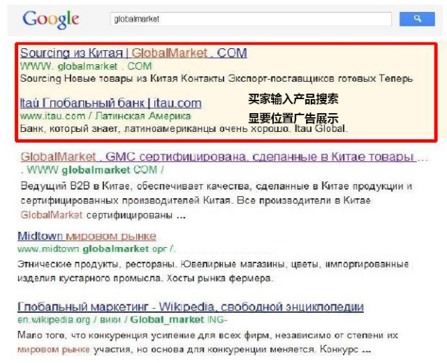 2、Google俄语搜索关键字推广 Google俄语搜索关键字推广和百度,Google等搜索引擎的搜索引擎关键企业 公共关系字是一样的,广告主选择购买的关键词,当用户在搜索框内输入关键词,即可触发广告,广告会在显要位置进行广告的展示。广告主可以自主选择关键字的设置,广告主所投放的广告会在Google俄语搜索引擎显要位置展示。(广告位置如下图)
