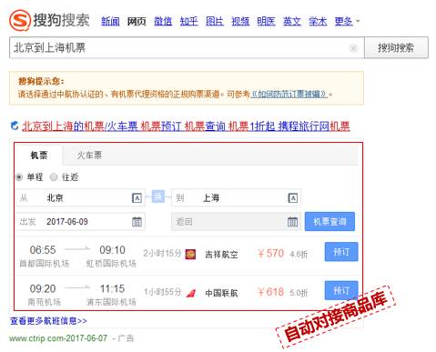 对大型客户来说,每天都会有成百上千条商品信息变更,手工更新这些信息费时费力,效率极低。如果只用同一条创意,展现又不能满足网民需求,导致推广效果不好,潜在用户白白流失。橱窗样式通过与客户的产品库的对接,实现投放完全自动化,创意无需人工更新,当网民搜索相关产品时,直接调取客户产品库信息,在搜索结果页展现。 OTA橱窗 OTA(在线旅游)行业的橱窗样式,适合有产品库对接能力的大客户投放,在PC端首位展现,CPC计费。系统根据网民的搜索词,自动匹配客户广告库中相关的产品信息,前置展现。 橱窗样式对比普通样式,点击率提升50%以上!