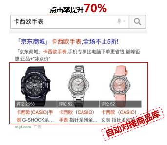 2、已有创意物料的自由组合,大幅提升点击率 系统根据客户旭日已有物料,智能选择,灵活组装,融合成最符合网民需求的形式,展现在搜索结果页。在点击率大幅提升的同时,大大节省客户的投放成本!