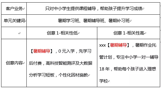 关键词二:相关 “好”创意一定要与网民的需求强相关! 例如,做暑期托管班的客户,如只宣传辅导班的优势,未提示只针对“中小学生”人群,这样会带来大量误点击(如创意1)。若注明“专注中小学一对一辅导18年”,可有效排除大学生,研究生上海医药广告有限公司等群体(如创意2)。