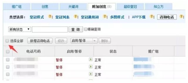 工具三:批量编辑附件创意工具 针对QQ咨询、电话咨询两种附加样式,旭日后台可以实现全部物料批量编辑。 1、用户进入QQ咨询或咨询电话列表,勾选“选中全部”按钮即可选中当前列表的全部物料; 2、选中后,可批量进行“修改”、“启用”、“暂停”、“删除”等操作;