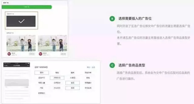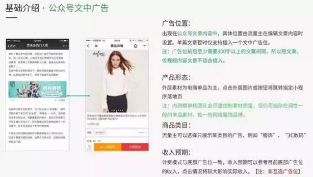 广告位置: 出现在公众号文章内容页,具体位置由流量主在编辑内容时设置。单篇文章暂时仅支持插入一个文中广告位。 (注意:广告位起那后至少需要300字以上的文案间隔,所以短文章、仅有视频内容的文章不适合插入) 产品形态营销推广的主要方法: 外层素材为电商单品为主,点击外层图片或者按钮将跳转指定小程序落地页。 注意:内测期审核团队会尽量控制素材质量,但仍然可能出现调性一般般的广告素材,比如一些网络服饰品牌等。 商品类目: 流量主可以选择只展示某类的广告,例如“服饰”、“3C数码”等。 收入预期: 计费模式与底部广告位一致。(注:非互选广告位)