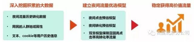 晚间整体解决方案 夜间洞察-晚间流量专题报告,从行业流量潜力、同行竞争分析、账户自身潜力、TOP晚间流量词四个维度精准判断流量价值,提供高质量流量给广告主,帮助广告主提升投放效果; 投放优化-使用夜间智投,智能锁定高价值流量,开启功能后,当投放时段已搁置但还有预算时,在18-24点自动突破投放时段限制,通过夜间流量优选模型智能锁定高价值流量并投放,若您已在投放晚间则会通过转化模型帮助网络营销对企业您过滤低质流量获取高质量流量。