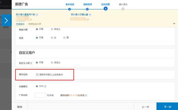 定向包就是将定向条件“打包”,消防危机公关广告可选择已创建定向包,便于多个广告快捷选择设置,减少重复选择相同定向条件的操作。 新增定向包: 新建广告进行定向设置后,在“常见引流保存定向”模块勾选“保存并关联以上定向条件” 进行定向名称和定向描述的填写,即可新建成功。