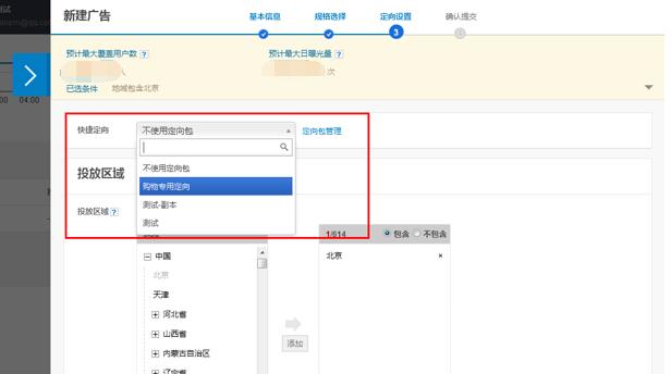 使用已创建定向包: 新建广告选择“快捷定向”下拉菜单,选择已创建资源包,该广告的定向条件将自动与所选的定向包同步。