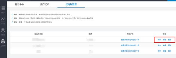 修改删除定向包: 如果想查看定向包,或对其进行复制、编辑、删除,可从工具箱中进入定向包管理页面进行操作。 -复东莞营销策划制:广告主可复制当前定向包定向条件 -编辑:编辑修改定向包中的设置,将会同步到与此定向包相关联的所有广告中 -删除:删除某定向包,将自动解除此定向包与所有广告关联,解除后已设置的广告定向条件保持不变