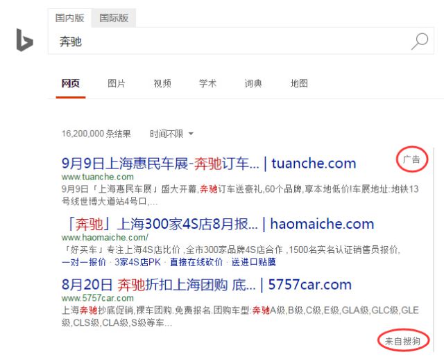 必应广告下方显示“来自搜狗” 这样展示是由于必应在中国市场份额太小,很早之前就已经停止了中国地区的关键词竞价广告的销售,与搜网络营销找客户狗搜索合作,展示搜狗竞价广告,参与分成,这样可以节省运营成本,搜狗对广告进行销售,在必应搜索结果展示的广告,被点击了,则给予必应分成。 搜索引擎进行合作合并的事情也发生了很多,比如有道搜索的搜索技术由360提供,有道参与360搜索广告分成即可。这种合并整合是较小市场份额的搜索引擎为了节省运营成本,获取更高利润而采取的联合合作的运营策略。 当然,Bing在全球的搜索市场份额是非常大的,其全球搜索引擎市场份额排名第二,因此Bing在国内依然有代理商在销售最近的电视广告Bing广告,其广告主要是面对中国的外贸出口企业,通过Bing国际版,将中国产品销售是海外市场。