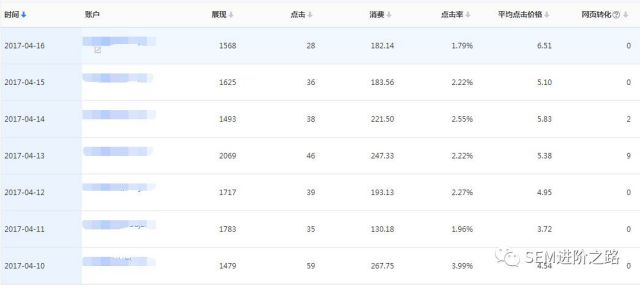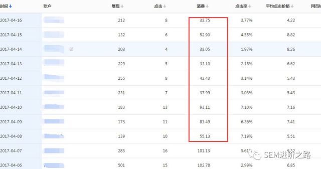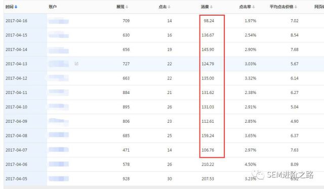 大约从4月7号到4月17号期间,不知道semer小伙伴们有没有发现,自己账户的消费下降了?如果对数据不敏感的同学,可能还稀里糊涂的进行日常优化操作,没有发现什么异常。从观察中发现,在将近2周的时间内,很多账户消耗降低40%左右,个人猜测是百度官方对竞价流量进行了收缩,虽然没有得到官方的证实。从数据的中可以发现趋势。
