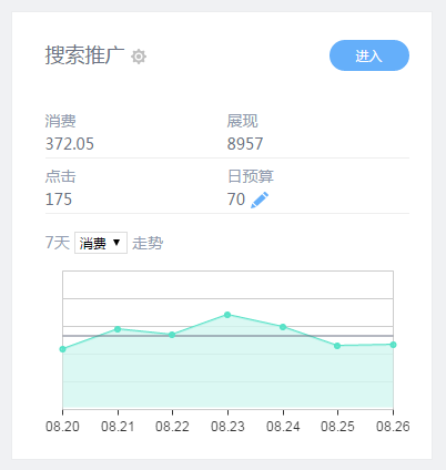 消费:是这时间段内的总的广告费用的消耗总额。默认是一周的时间段。 展现:就是你的广告被多少个人看到。 点击:有多少人点击你的广告进入了你的网站。 日预算:就是你每天打算多少花广告费。这个数值最低是50元。设定的时候一定谨慎,如果没有设定预算限制,并且关键词设定也有问题的话,恩……你可以分分钟把你老板搞破产。 点击和展现的比值,成为点击率,点击率能很直观的说明你的广告创意做的是不是吸引人。