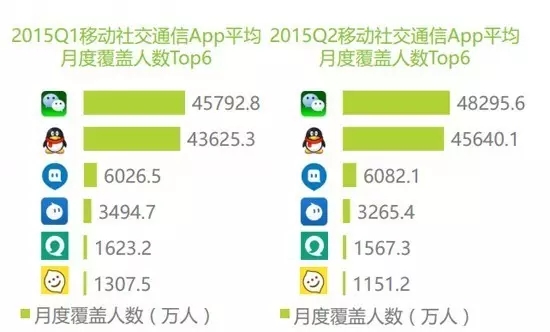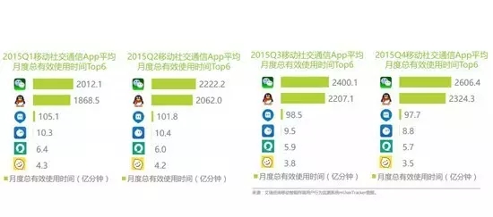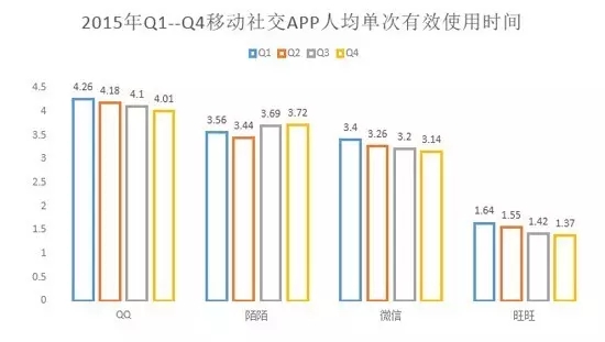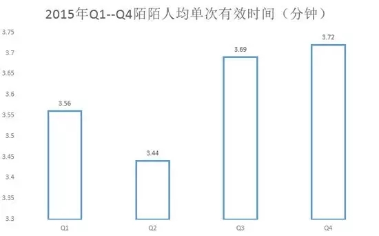 2015年全年移动社交通信行业月活、日活持续增长,Q4 App月活人数首次超过6亿,较Q1增长超过15%;日活人数Q4达3.7亿,较Q1增长16%。行业整体的有效使用时长从Q1的4028.0亿分钟逐步增长到Q4的5096.6亿分钟,人均有效使用次数从192.3次增长到217.4次。就移动社交领域整体格局而言,微信、QQ、陌陌各指标均稳居行业前三,并大幅领先其他App。2015年全年,微信、QQ月活、日活稳中有升,陌陌月活、日活总体保持平稳。 艾瑞咨询数据显示,不论是月活跃用户,还是日均活跃用户,陌陌2015年活跃用户是保持平稳,仅次于微信、QQ,位居第三。