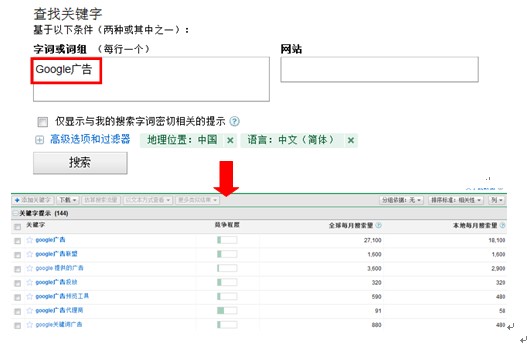 用途介绍: 该工具是为您的广告系列查找新关键字的B测试理想方式。在获取的关键字列表中选取想要的合适的关键字进行添加;在所获得的列表中可以参考到该关键字广告客户竞争程度、本地搜索量、全球搜索量等相关数据。同时对于不清楚某些网站该如何选择关键字的情况下可以使用“网站内容”功能选项,让系统帮助您分析您的网站,找寻合适的关键字,然后进行扩展。