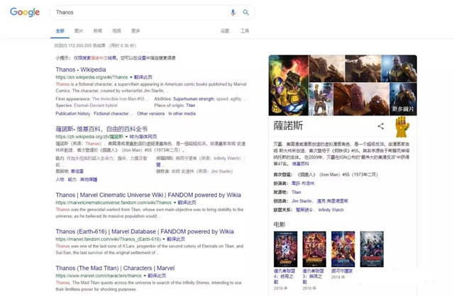 只要在Google的搜索框中搜索“灭霸”,中文“灭霸“或者英文“Thanos”都可以,接着你就会发现页面右方有一个嵌有无限宝石的无限手套。