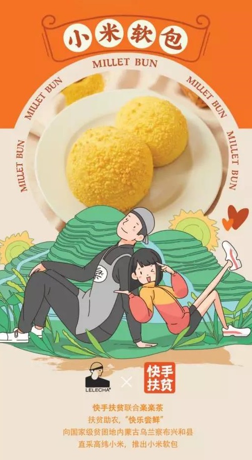 最初看到这套海报,还不知道这些人是快手员工,囧样的造型,夸张的表情,给人以不能忘记的感觉,不刻意也不沉闷,更像是一种内心的呐喊,一种渴望“出头”的决心。颇具质感的整体画面也亦如那些好货一样,让人觉得亲切,并有想买的冲动。有趣的文案则堪称点睛之笔,让人铭记于心。而快手员工的出镜,直接把快手和好货和消费者悄然联系在一起。 一直以来,活动类海报都给人直接灌输品牌、灌输产品、引导参与或直接购买为主。但在快手的海报里,大家甚至没有对品牌甚至活动产生过多感知,人和物成为焦点,让消费者自己对最重要的信息产生印象,这点格外难得,也颇有创新。 3、“快手的第一次” 快手有着很多次第一次,而首次与「网红店」乐乐茶的跨界算是整个活动里的一大亮点。一边是坐拥1.6亿日活用户短视频巨头,一边是当红的潮流品牌店,这样的组合从最开始就看点十足。为了能够吸引最大的关注,活动期间,乐乐茶北京所有门店都推出了专门设计过的符合年轻人口味和态度的软包产品,原材料则直采于活动中的贫困地区特色农品。