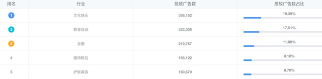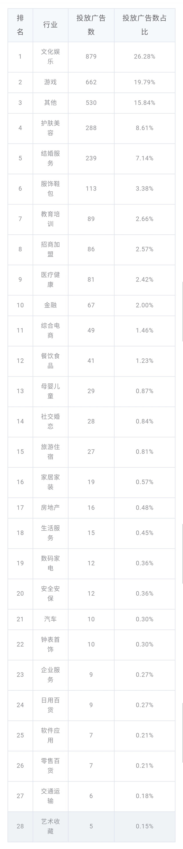 数据来源:AppGrowing广告情报追踪 从追踪到的情报数据看来,微博粉丝通近一个月投放类别TOP4分别是: 1.文化娱乐 2.游戏 3.护肤美容 1.结婚服务 占平台总投放数据的一半,其中投放占比第一的文化娱乐投放占比为26.28%。(文化娱乐类别中小说占比很高) 对比腾讯广告平台投放数据,前四名则是文化娱乐、教育培训、金融、服饰鞋包。