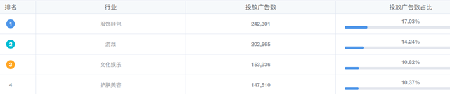 截图为AppGrowing广告情报追踪后台 对比巨量引擎投放数据,前四名则是服饰鞋包、游戏、文化娱乐、护肤美容。