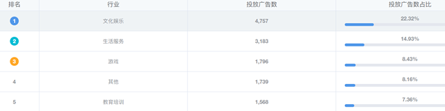 截图为AppGrowing广告情报追踪后台 对比360点睛平台投放数据,前四名则是文化娱乐、生活服务、游戏、教育培训。