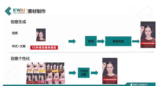 智能运营的核心是出价系统。广告主设定目标之后,快手营销平台会自动帮商家竞价,以满足中小客户的投放要求。而针对广告主多样化的投放目的(如激活、留存、下单、付费、以及金融行业的授信),快手用强化学习来智能出价,并且持续动态调整价格,以达到客户目标。孔东营透露,目前团队正在尝试满足客户更为复杂的投放目标(比如保证激活的情况下,优化留存)。 素材制作:让广告不枯燥 目前,快手广告平台的素材制作主要是封面制作。即便是最常见的一张封面,也由底图、文案和样式三个元素组成。孔东营认为,与其他平台不同,短视频广告素材的制作成本较高。因此在封面选择上,创意个性化能够生成抓人眼球的最佳广告封面。