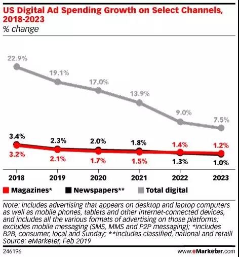 数字广告抢夺传统广告市场份额的趋势还在继续,面对冲击,传统纸媒的该何去何从? 在总体广告支出中,传统广告的市场份额仍是大于数字广告的。 但根据eMarketers预测,今年美国的数字广告支出将增长19.1%,达到1293.4亿美元。而传统广告的增长速度放缓,其中报纸和杂志的广告支出将分别增长2.3%和2.1%。