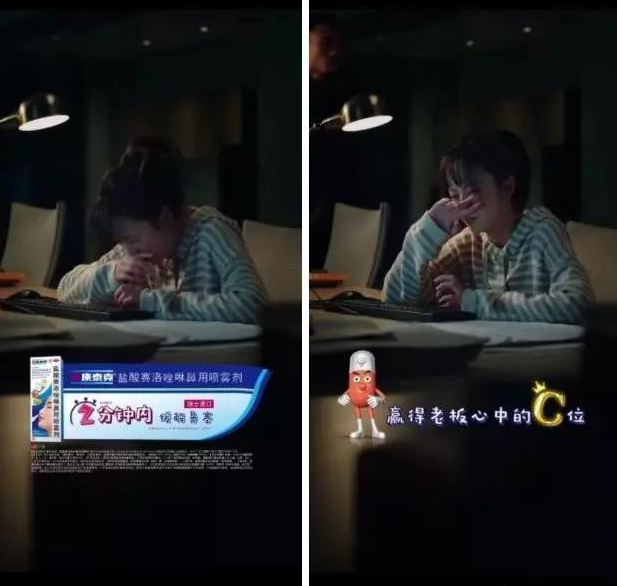 看到这里,眼尖的网友发现此处有植入哦!没错,就是我们的金主爸爸新康泰克鼻喷啦~作为首个尝试竖屏内容的医药品牌,此次新康泰克鼻喷与《导演对我下手了》的成功合作,不仅展现了品牌对于类似竖屏短视频这种新兴内容把控的敏锐度,也为其他药企在内容植入上起到一定的借鉴意义。 内容植入第一招:创可贴巧妙植入,“笑”果深入人心 新康泰克鼻喷在剧中的创可贴植入,结合了剧情与产品的卖点,通过夸张演绎效果,让产品植入更有记忆点,产生强关联,让消费者印象深刻,有助于品牌的二次传播。如,为女主饰演的小助理支招,加班感冒也不怕,用新康泰克鼻喷2分钟内缓解鼻塞,祝她赢得老板C位。