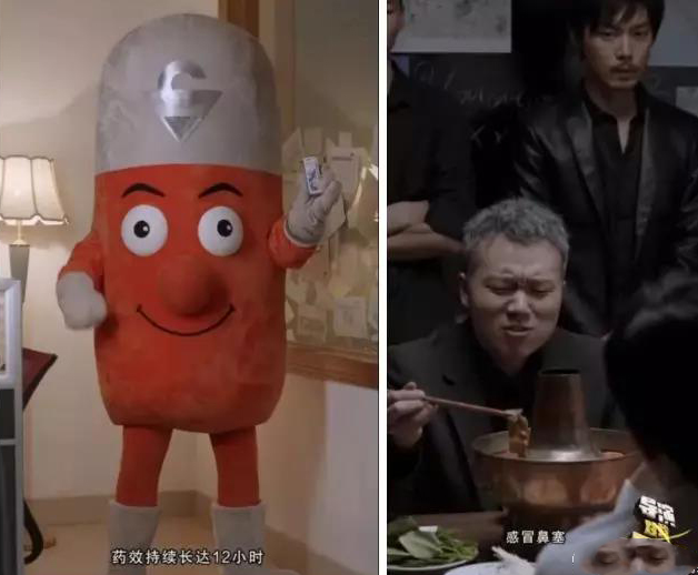 又比如,警察审问黑帮头目,导演特意让演员从吃盒饭改为吃火锅,原因就是鼻子塞住了,吃火锅通通气,这时警员立马推荐新康泰克鼻喷,我们金主爸爸的产品可比火锅有用多了。