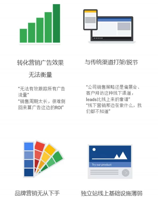 为什么在 B2C 企业纷纷将线上营销作为最主要渠道进行深耕时,B2B 企业还普遍在传统渠道和线上渠道间摇摆不定?为什么看着 B2B 同行的线上营销成功案例这么难复制?为什么 B2B 营销人的共同认知都是线上渠道难做? 在和大量 B2B 出海企业的合作过程中,我们通过对行业中观察到的 B2B 线上营销现状进行了详细观察和具体分析,归纳出四大痛点,并针对各个痛点提出了谷歌建议解决方案。 B2B 数字化出海痛点观察 如果说 B2C 出海是出海捕鱼,那 B2B 出海营销的难度就只能用海底捞针来形容了。如何实现更精准的投放,设计更专业的内容,如何在自身组织内部建立有效的销售流程,都是每天考验着 B2B 营销人的难题。 从各行业 B2B 客户的长期沟通过程中,我们总结出了大家最感同身受又最需要解决的四大痛点,同时邀请谷歌中国区四位在 B2B 行业资深的账户经理为大家分析痛点同时详细讲解解决方案。 我们听到看到的B2B数字营销普遍痛点