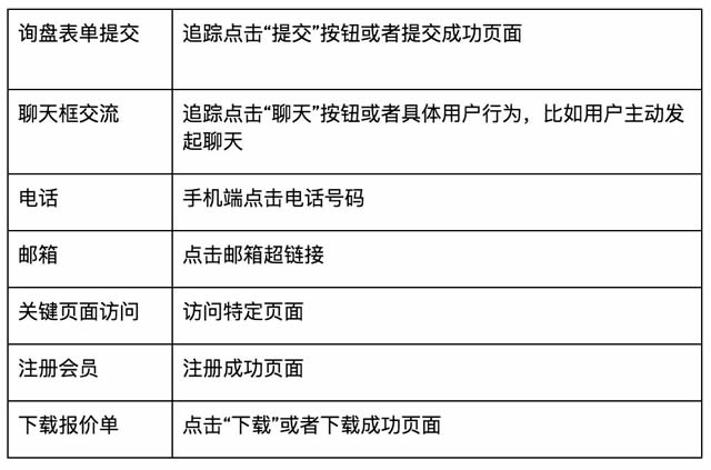 谷歌观点:线上市场数据和线下销售数据打通,实现 B2B 转化闭环追踪,营销效果看得见! 01.把有价值转化操作全部记录在 Google Ads 上。这样广告主才能更科学,更系统地分析广告效果,也能让 Google Ads 这台“智能机器”更好地了解学习业务,用更智能的功能优化广告投放。把有价值转化操作全部记录在 Google Ads 上。这样广告主才能更科学,更系统地分析广告效果,也能让 Google Ads 这台“智能机器”更好地了解学习业务,用更智能的功能优化广告投放。 以下常见的网站转化动作都可以在 Google Ads 追踪:
