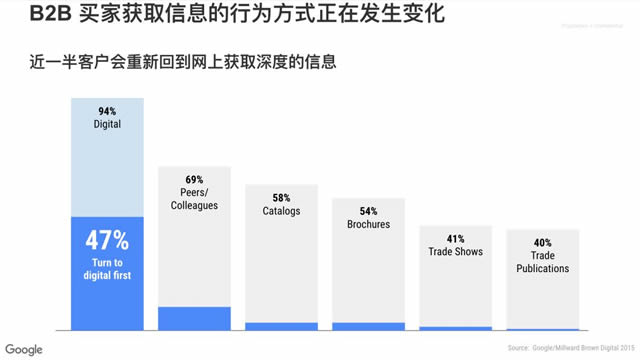 痛点 2:线上渠道与传统渠道,打架/脱节 目前绝大部分 B2B 外贸企业仍然看重传统线下渠道,比如海内外展会或者地面销售,在展会中产品得以真实全面的展示,卖家有机会跟潜在采购人员直接产生联系,直接进行深度交互,这些都是展会营销的亮点。 然而,通过多年市场观察表明,展会的营销效率在逐渐下滑,一部分原因是采购人员获取信息的方式在发生变化,94% 的采购人员会先通过上网获取信息,其二这中间有半成会在犹豫期再次回到网上获取更多信息来辅助决定过程。另一部分原因是展会通常由巨头承包赞助,从曝光度上让小商家失去脱引而出的机会。